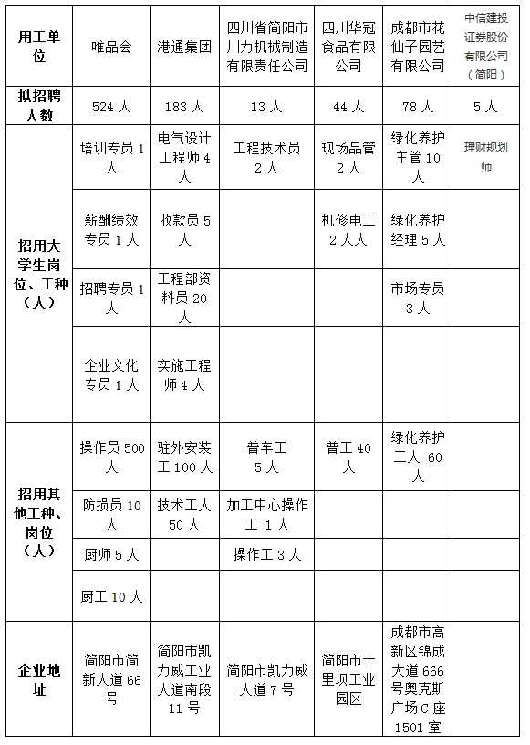 招聘單位:唯品會(huì)、中信建投證券股份有限公司、簡(jiǎn)陽(yáng)雄州大道證券營(yíng)業(yè)部、港通集團(tuán)、四川凱力威科技股份有限公司及四川省簡(jiǎn)陽(yáng)市川力機(jī)械制造有限責(zé)任公司等20余家用人單位。